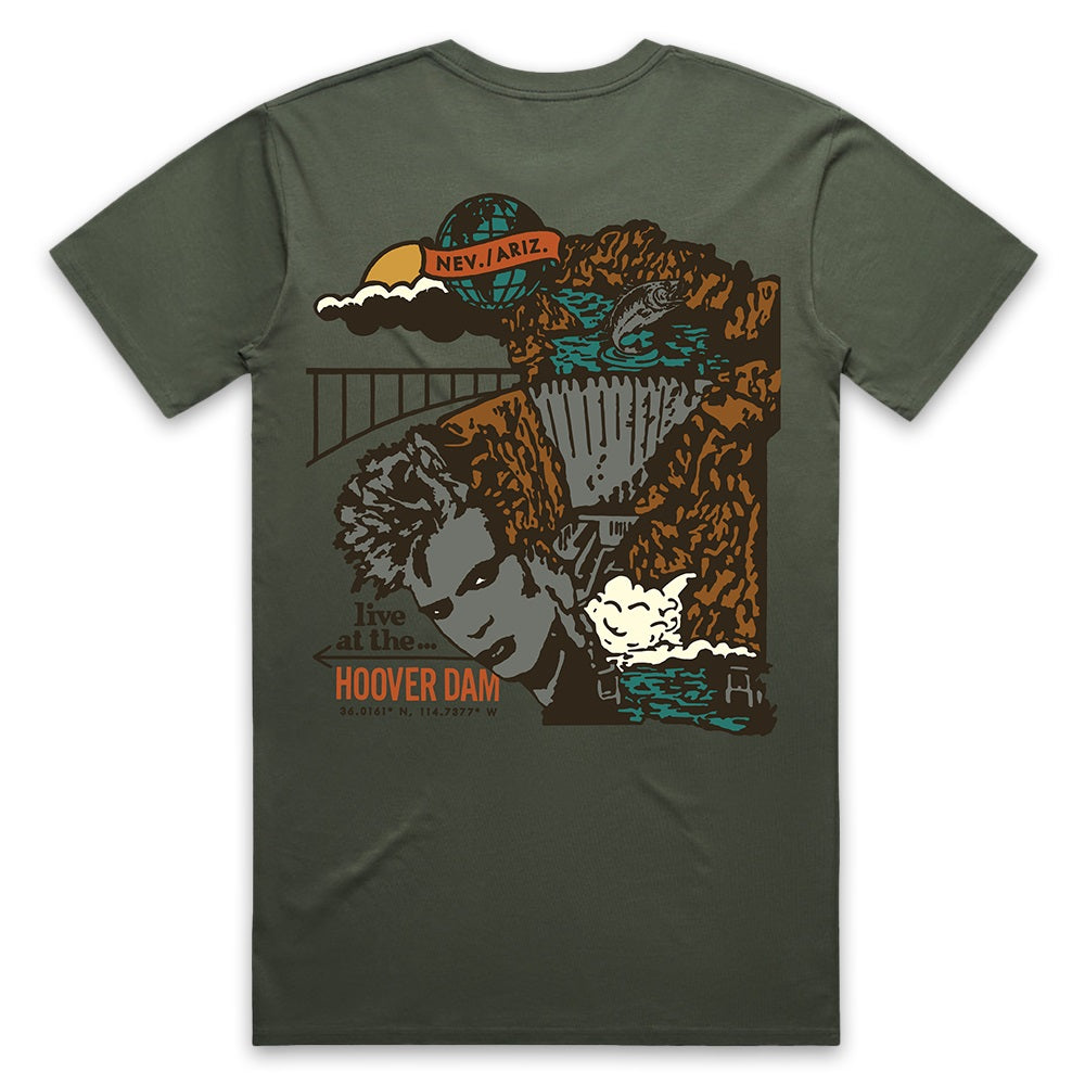 Premium unisex black t-shirt featuring a 'Billy Idol' front print and 'Live at the Hoover Dam' back print.