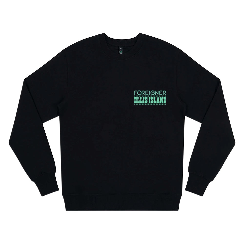 Premium unisex black sweatshirt featuring a 'Foreigner' front print and 'Live at Ellis Island' back print.